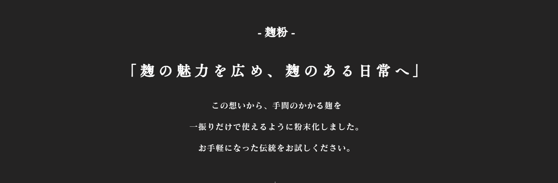 古来より日本の味噌、醤油、酢、清酒づくりを支えてきた「麹菌」は、唯一無二の自然調味料。この伝統を次世代に伝承するのが私たちの使命です。