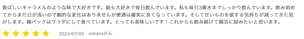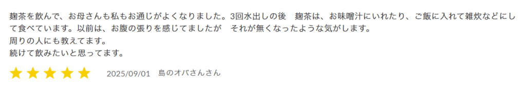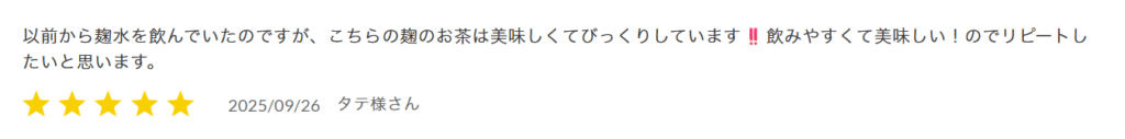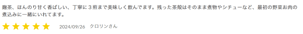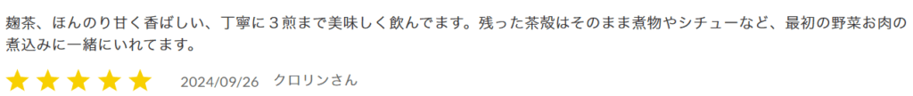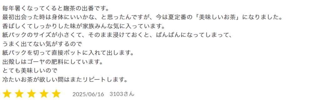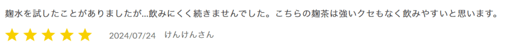 「こうじ水は体に良いと聞いても独特の風味が気になる…」という方でも、麹茶なら香ばしくてすっきりした後味なので毎日無理なく取り入れられます。実際に飲んだ方からも、